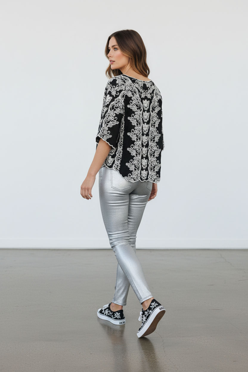 Blusa Solitaire Boho-Chic Negra con Bordado Blanco
